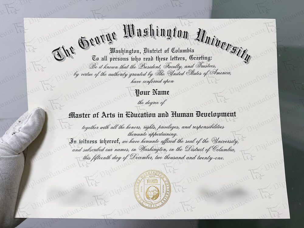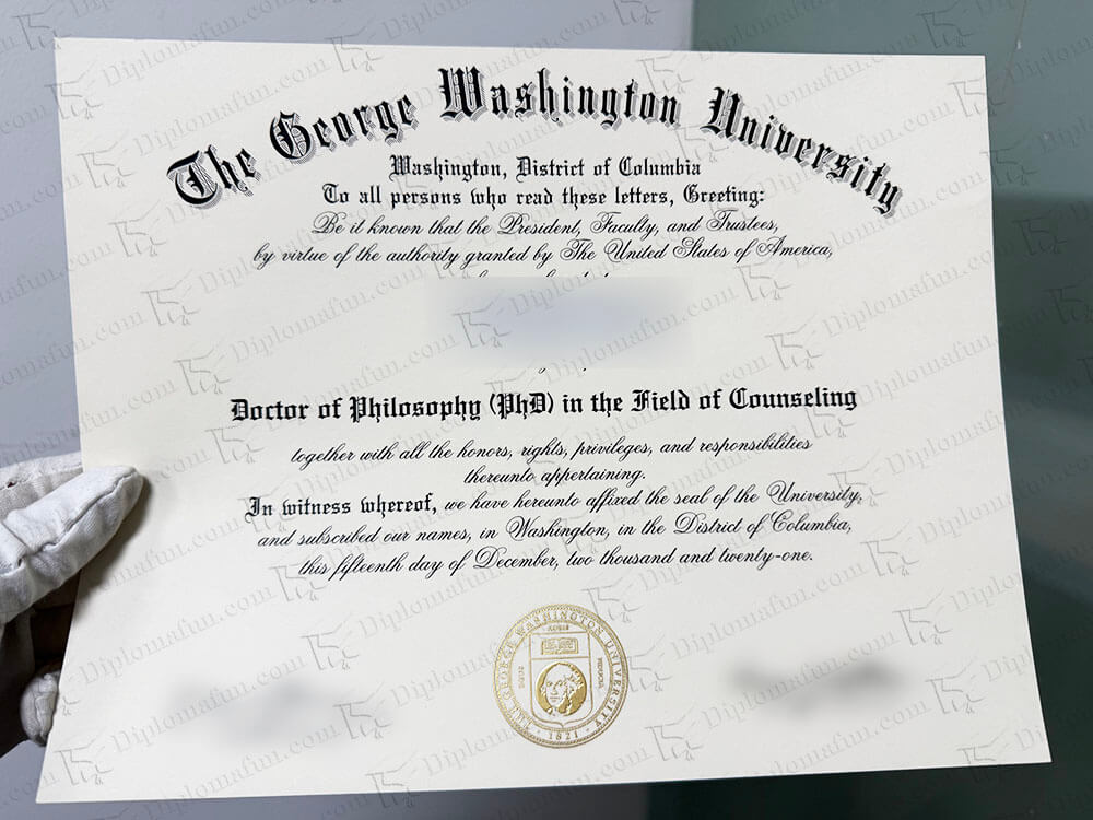 GWU毕业证和GWU成绩单是就读后的标配,此外还有乔治具有大学的学生卡,及学校发的在读证明,和它的文凭外壳等,都是在就读相应学位后由学校统一颁发。购买乔治华盛顿大学毕业证,就找专业的国外大学毕业证购买公司公司diplomafun.com来完成。我们提供毕业证加急办理服务,可以根据自己就读的专业,合理的选择办理本科毕业证,硕士文凭,及博士学历证书。如果回国发展,面对家人的询问或是查验,可以选择性的办理真实的,留信认证,留才认证,或是海牙认证。如果想要拿到一份和学校原版完全一样的乔治华盛顿大学学历文凭,可以和我们客服联系。24小时在线提供在线咨询服务,1:1复刻还原文凭学历,透明公开的合作流程,服务至上,在注重隐私的同时,确保交易的完整性和满意度。