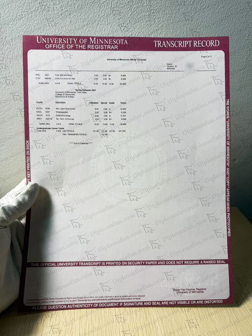 美国大学挂科或辍学时,如何拿到一份官方原版成绩单?美国大学毕业成绩单的获取条件是修够学分,达到学校的毕业要求。明尼苏达大学成绩单采用竖版排列,整体颜色为暗红和白色为主。成绩单尺寸是美国letter信纸大小,厚度为120克。成绩单四周有红色外框,顶部是学校名和成绩单名称。红框左边,是说成绩单背面有学分规则。红框右边,明确认了成绩单有学位名和COPY字样的底纹。底部两外红色的文字,第一条是说成绩单印在安全纸上,不需要另外的凸版印章。另一句话是说,如果签名或印章不见或变形,该文件的真实性就需要注意。根据自己的专业,定制明尼苏达大学成绩单。完成明尼苏达大学成绩单购买,复刻美国原版成绩单,就找专业的成绩单制作公司。那么,办理明尼苏达大学成绩单,需要提供哪些资料呢?成绩单上的课程和分数如何提供?