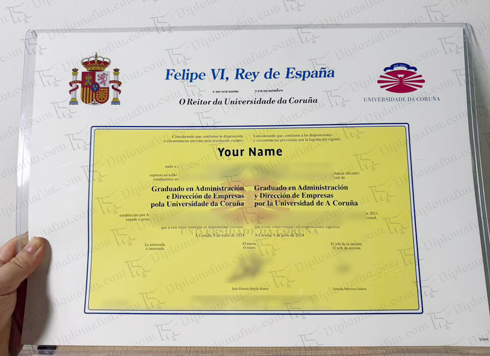 拉科鲁尼亚大学毕业证样本,拉科鲁尼亚大学文凭证书。专业的西班牙大学毕业证公司,快速在线更新西班牙大学文凭样本。该校优势学科集中在旅游、健康科学、社会科学、工程建筑四大方向。旅游学依托地区文旅资源,注重实践与国际化培养,就业率高;健康科学开设理疗、职业治疗等实用专业,职业治疗专业排名西班牙。教学与临床结合紧密;工程与建筑实力突出,机械、土木工程均上榜世界学科排名,工业电子、海洋技术等特色鲜明,紧贴产业发展;社会科学涵盖法律、经济、管理等专业,课程实用,就业面广。学校还开设数据科学、时尚管理等新兴专业,紧跟时代发展,坚持创新育人。拉科鲁尼亚大学纸制文凭,尺寸类似于A3大小。毕业证厚度为180克,毕业证上的主要防伪是钢印。它可以作影视道具,或是小礼品用来收藏。并不代表具有真实的学历水平。在学校系统可查的,才是学习官方唯一的真实证书。